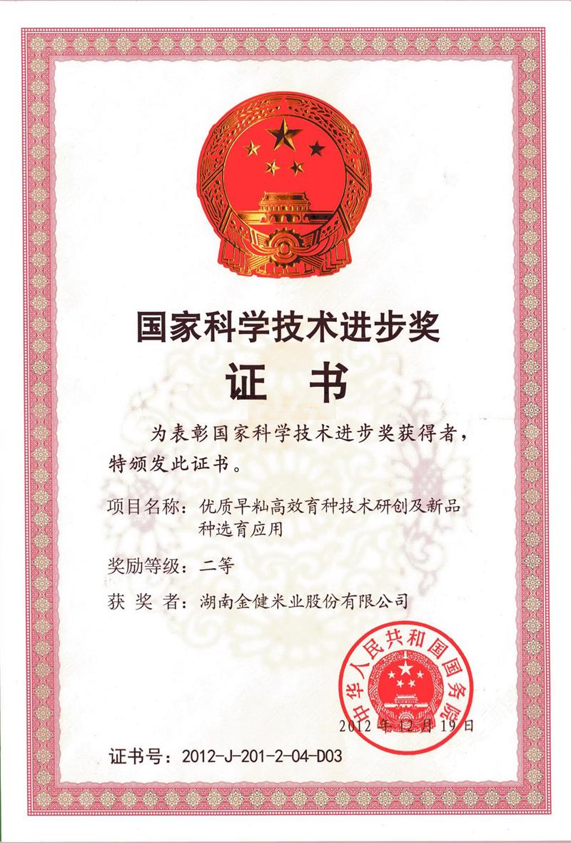 2012年12月,“优质早籼高效育种技术研创及新品种选育应用”获国家2012年科学技术进步二等奖。