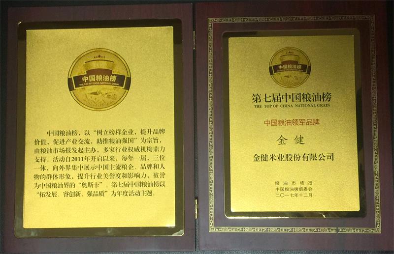 2018.03在中国粮油财富论坛暨第七届中国粮油榜颁奖典礼上,金健荣获“中国粮油领军品牌”和“中国大米加工企业50强”两项殊荣。