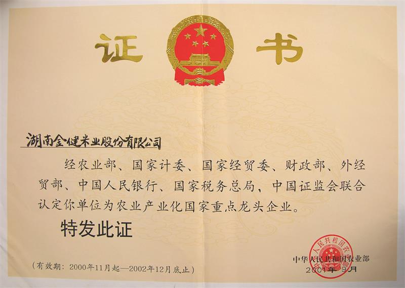 2000年11月7日,农业部、国家计委等国家八部委联合评议审定公司为“农业产业化国家重点龙头企业”