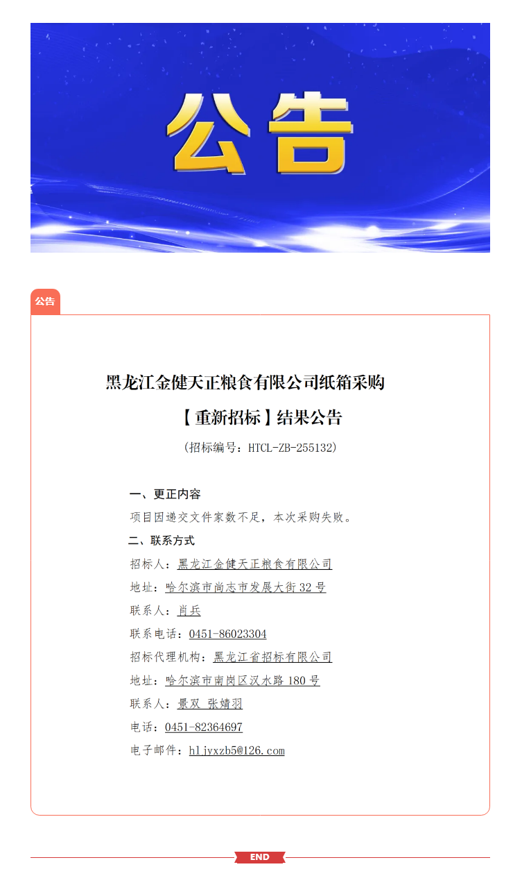黑龙江金健天正粮食有限公司纸箱采购【重新招标】结果公告