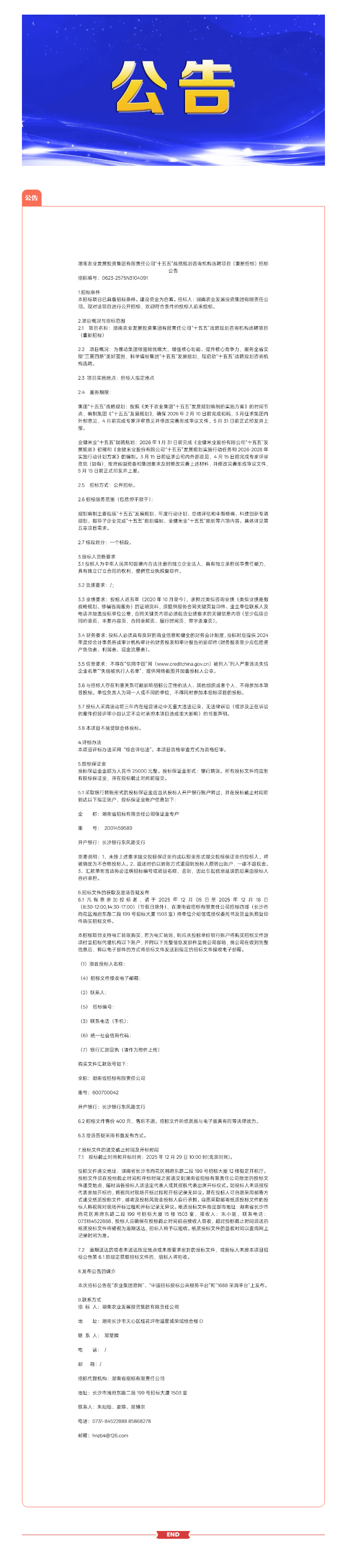 湖南农业发展投资集团有限责任公司“十五五”战略规划咨询机构选聘项目(重新招标)招标公告