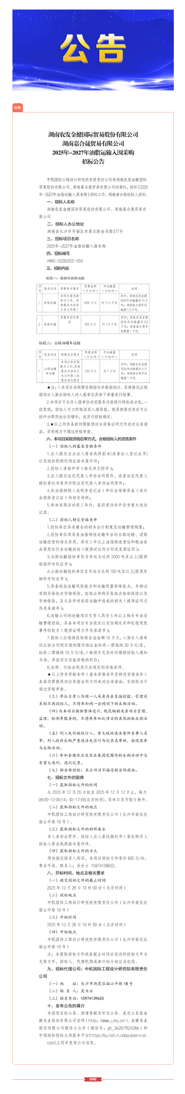 湖南农发金健国际贸易股份有限公司湖南嘉合晟贸易有限公司2025年-2027年油脂运输入围采购招标公告