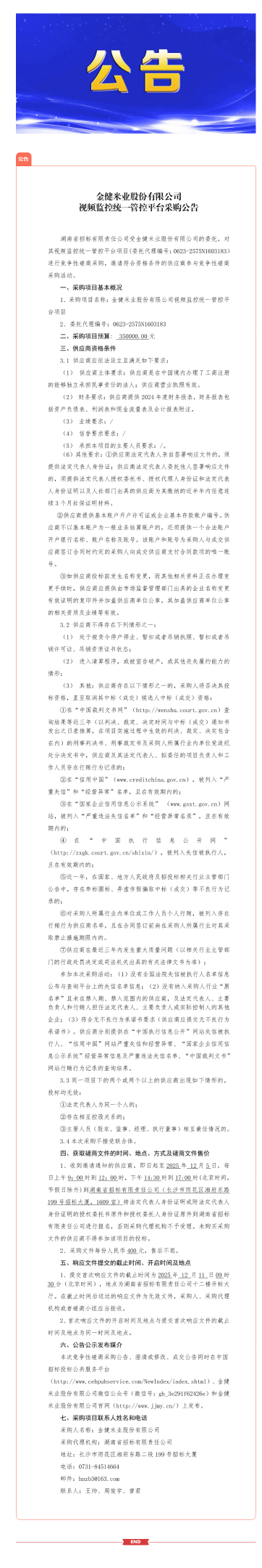 金健米业股份有限公司视频监控统一管控平台采购公告