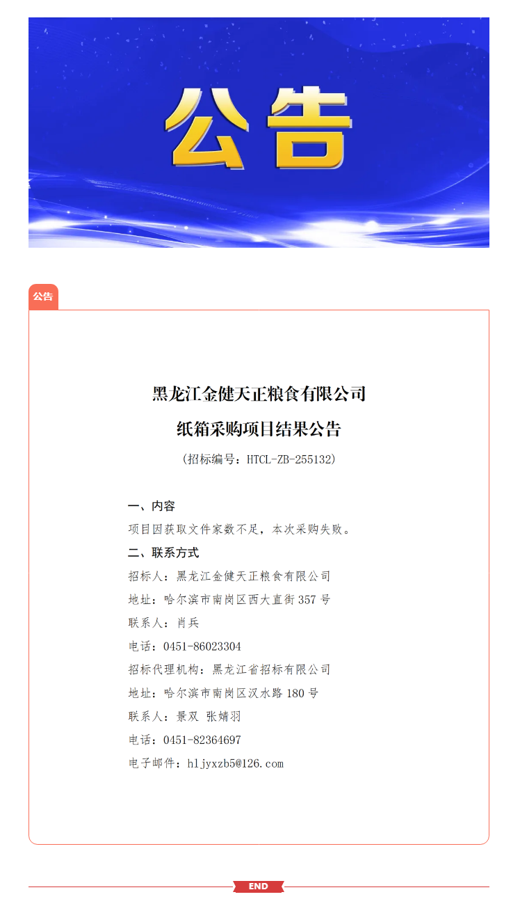 黑龙江金健天正粮食有限公司纸箱采购项目结果公告