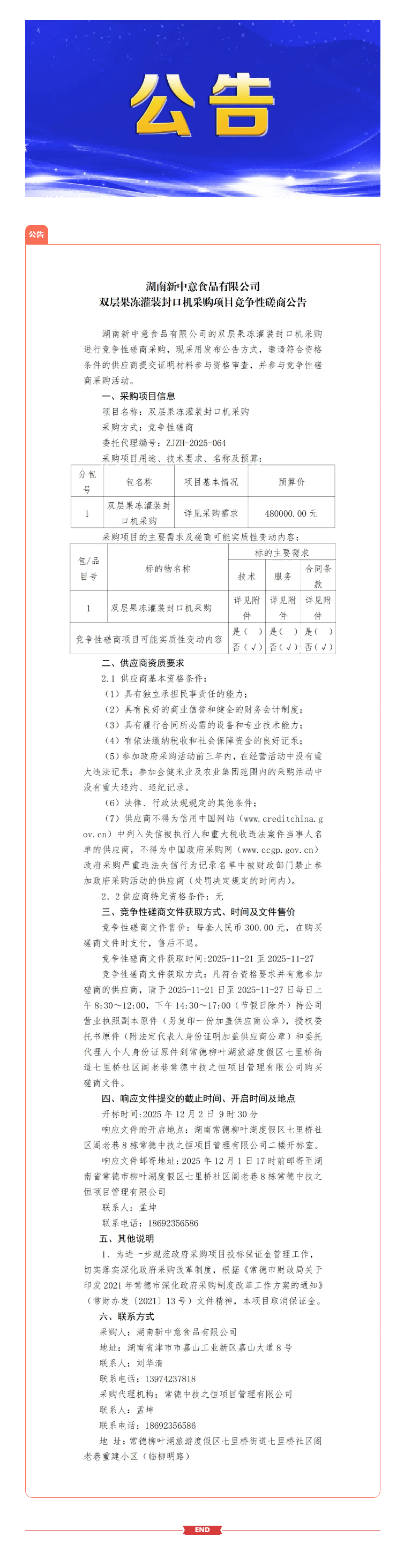 湖南新中意食品有限公司双层果冻灌装封口机采购项目竞争性磋商公告