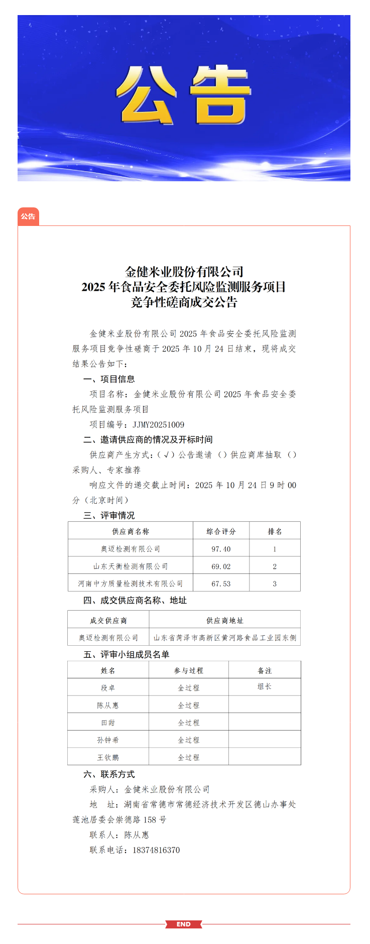 金健米业股份有限公司2025年食品安全委托风险监测服务项目竞争性磋商成交公告