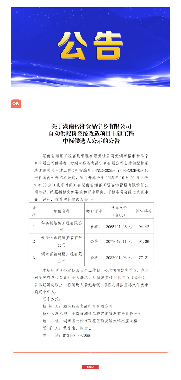 关于湖南裕湘食品宁乡有限公司自动供配粉系统改造项目土建工程中标候选人公示的公告
