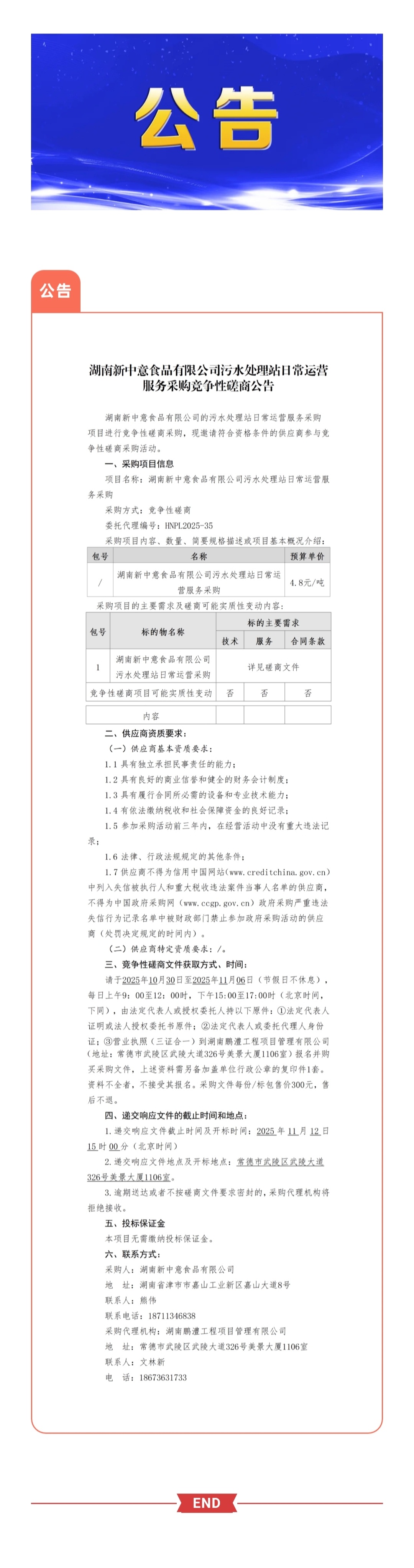 湖南新中意食品有限公司污水处理站日常运营服务采购竞争性磋商公告