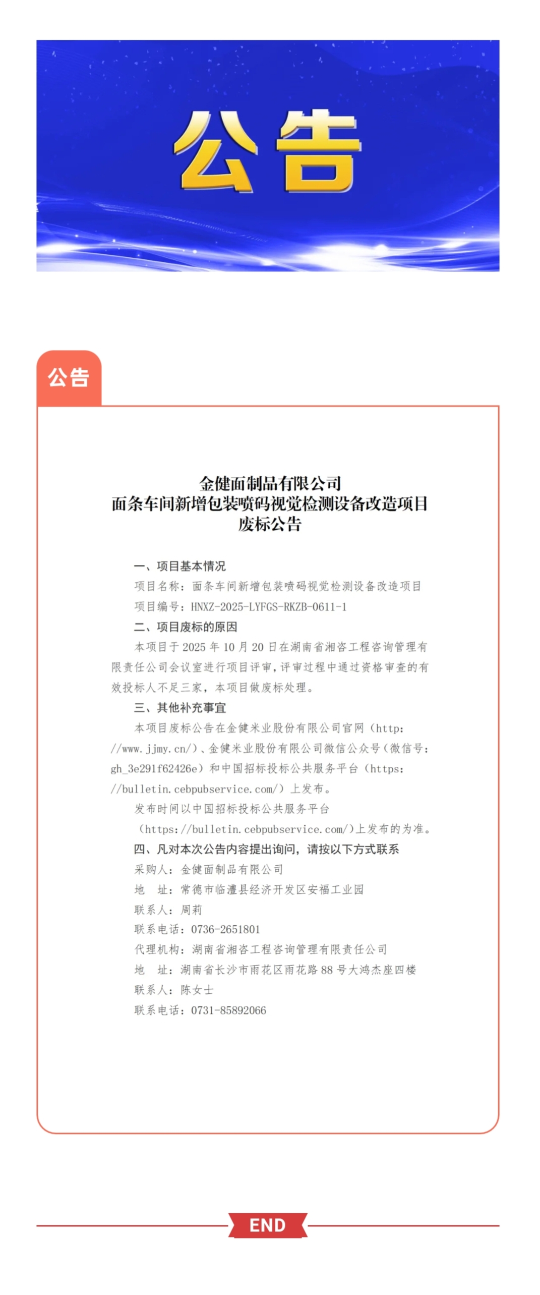 金健面制品有限公司面条车间新增包装喷码视觉检测设备改造项目废标公告