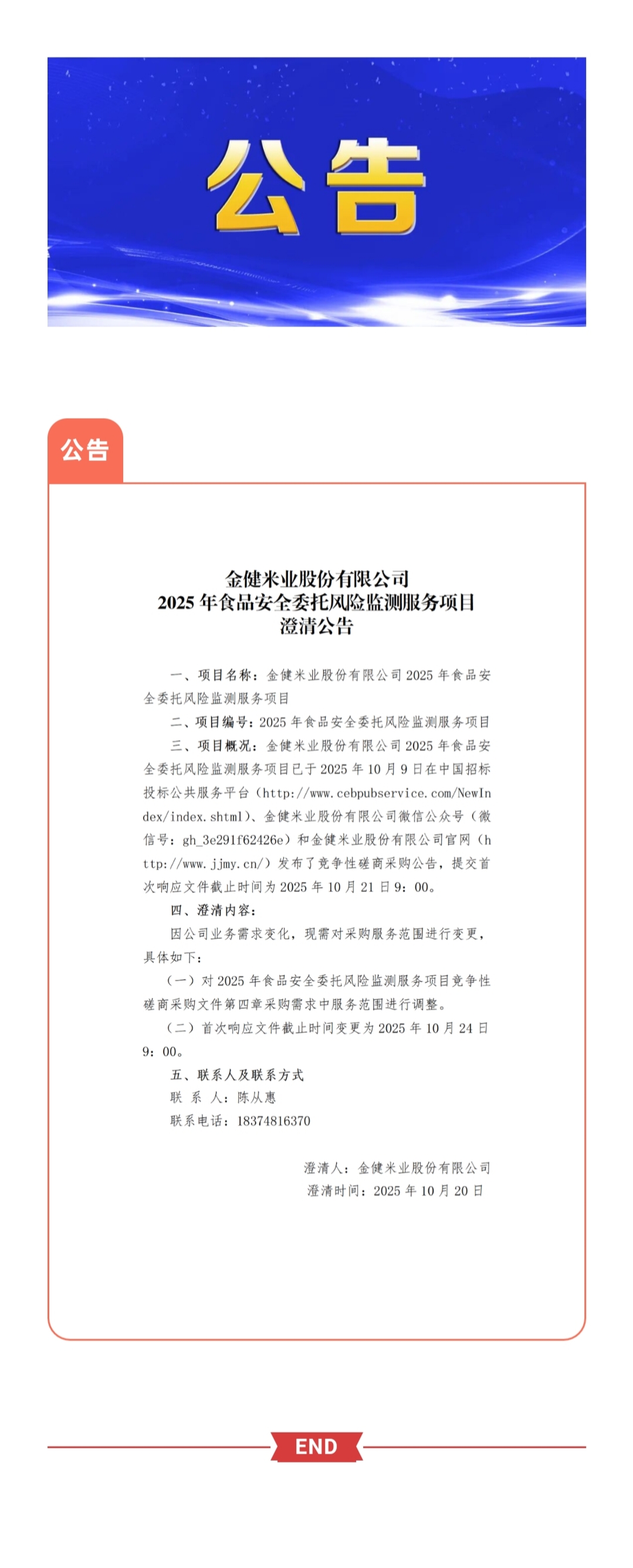金健米业股份有限公司2025年食品安全委托风险监测服务项目澄清公告