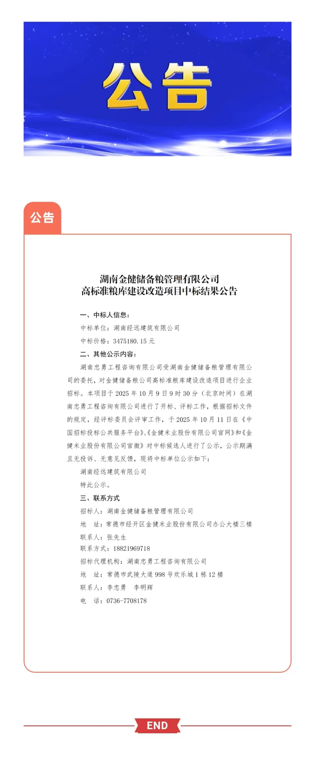 湖南金健储备粮管理有限公司高标准粮库建设改造项目中标结果公告