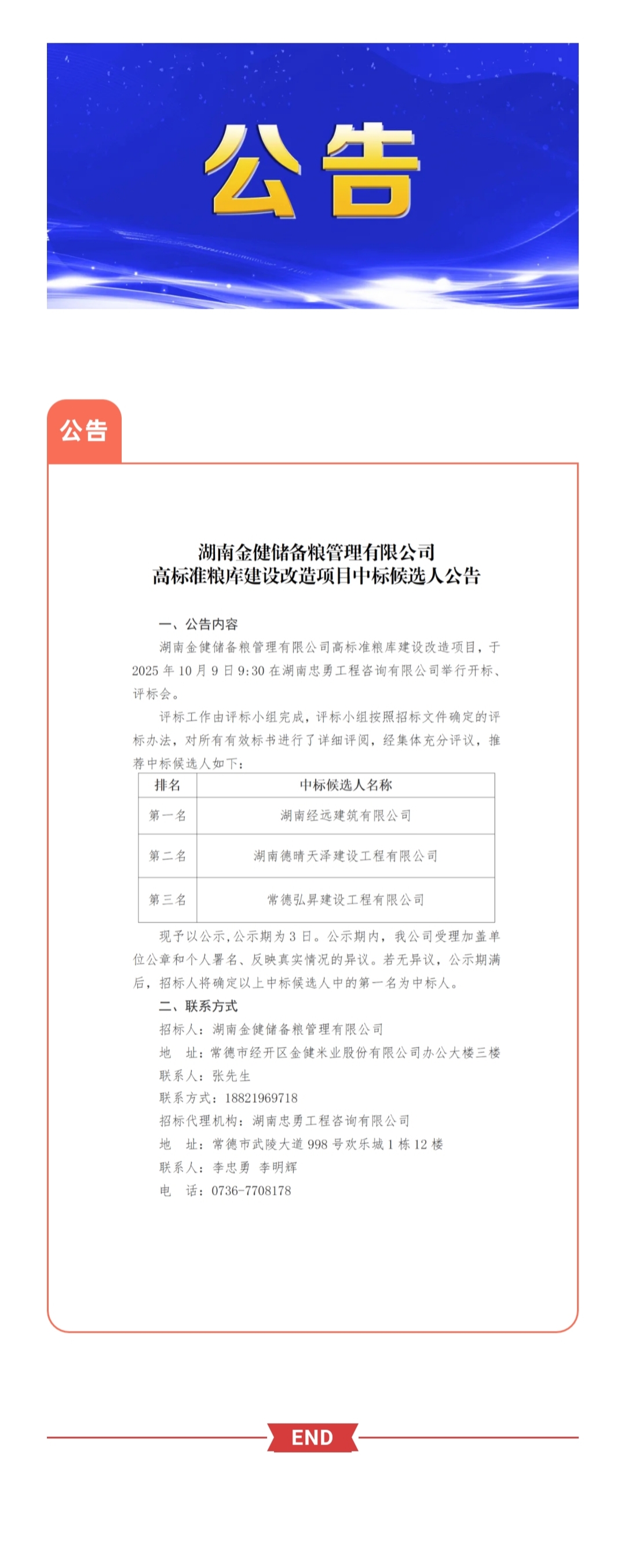 湖南金健储备粮管理有限公司高标准粮库建设改造项目中标候选人公告