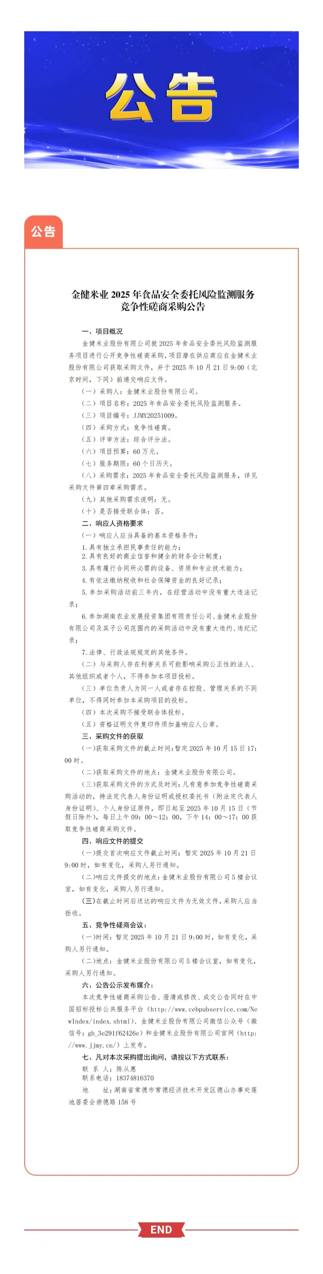 金健米业2025年食品安全委托风险监测服务竞争性磋商采购公告