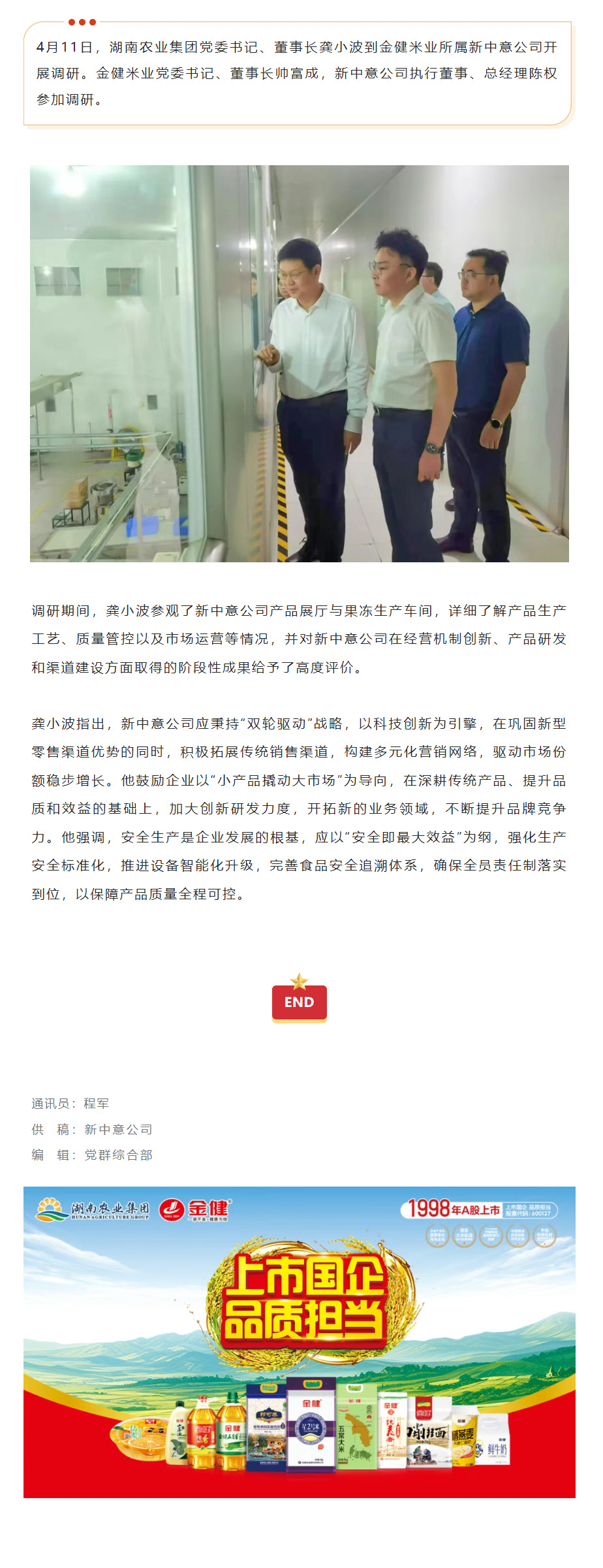 湖南农业集团党委书记、董事长龚小波一行调研新中意公司