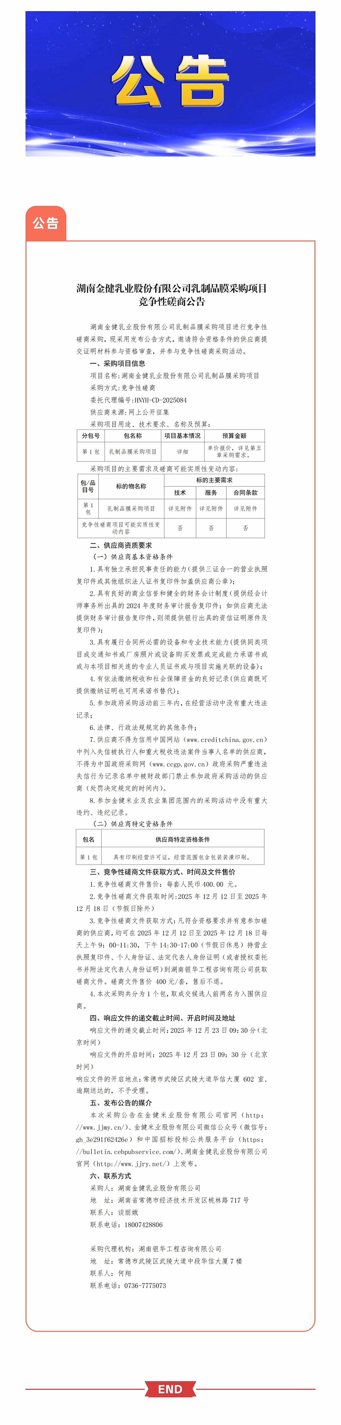 湖南金健乳业股份有限公司乳制品膜采购项目竞争性磋商公告
