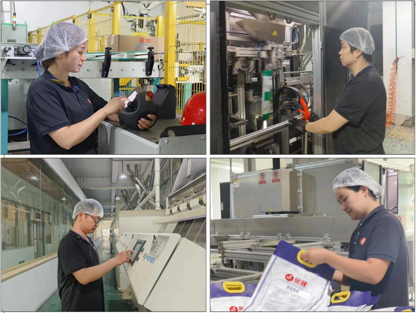 右上:常德精米厂主产品包装工作人员容艳华坚守工作岗位。