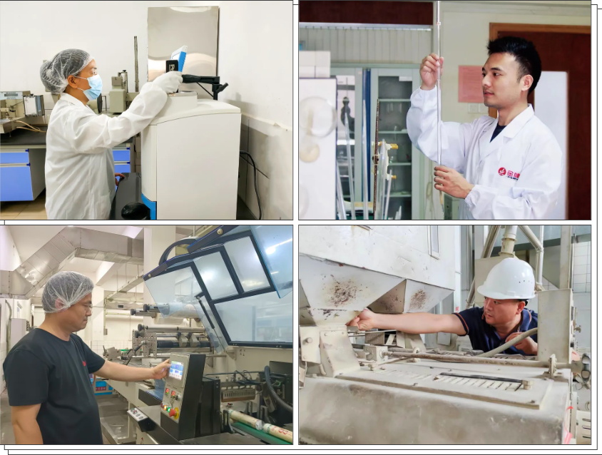 左上:“面检姐姐”蒋世芳在工作岗位上检验产品质量。