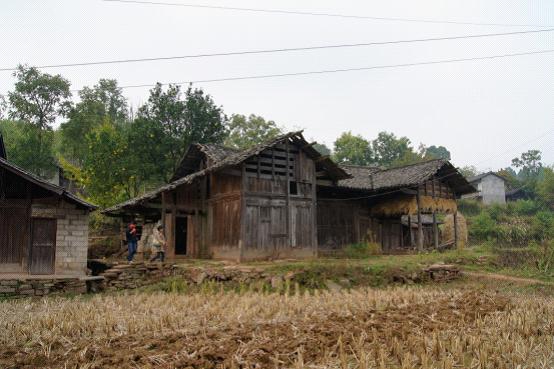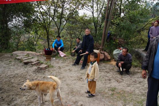 走了五个多小时的路程,尤其是在临近馒头咀时,车在弯曲的山顶道路上蜿蜒而行,看远处满眼苍山,连绵不绝,偶尔看到零落的村子居然尽掩映在山顶或是山腰,真有些“白云深处有人家”的味道。待到“村口”(其实是到了山顶),但见村民吹乐敲鼓,老弱妇儒尽至山头相迎。而村子偏僻,房前屋后杂树众多,而房屋却是破旧不堪,摇摇欲倒。
