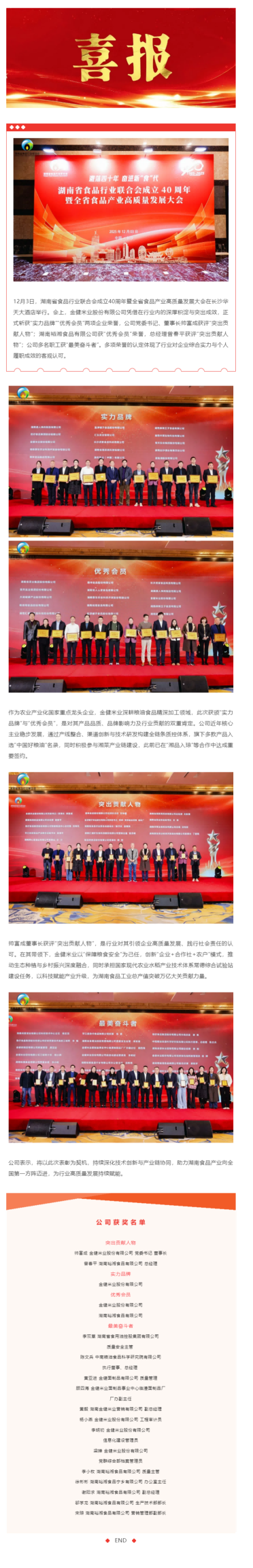 三项荣誉加身 金健米业在湖南食品行业40周年大会获表彰