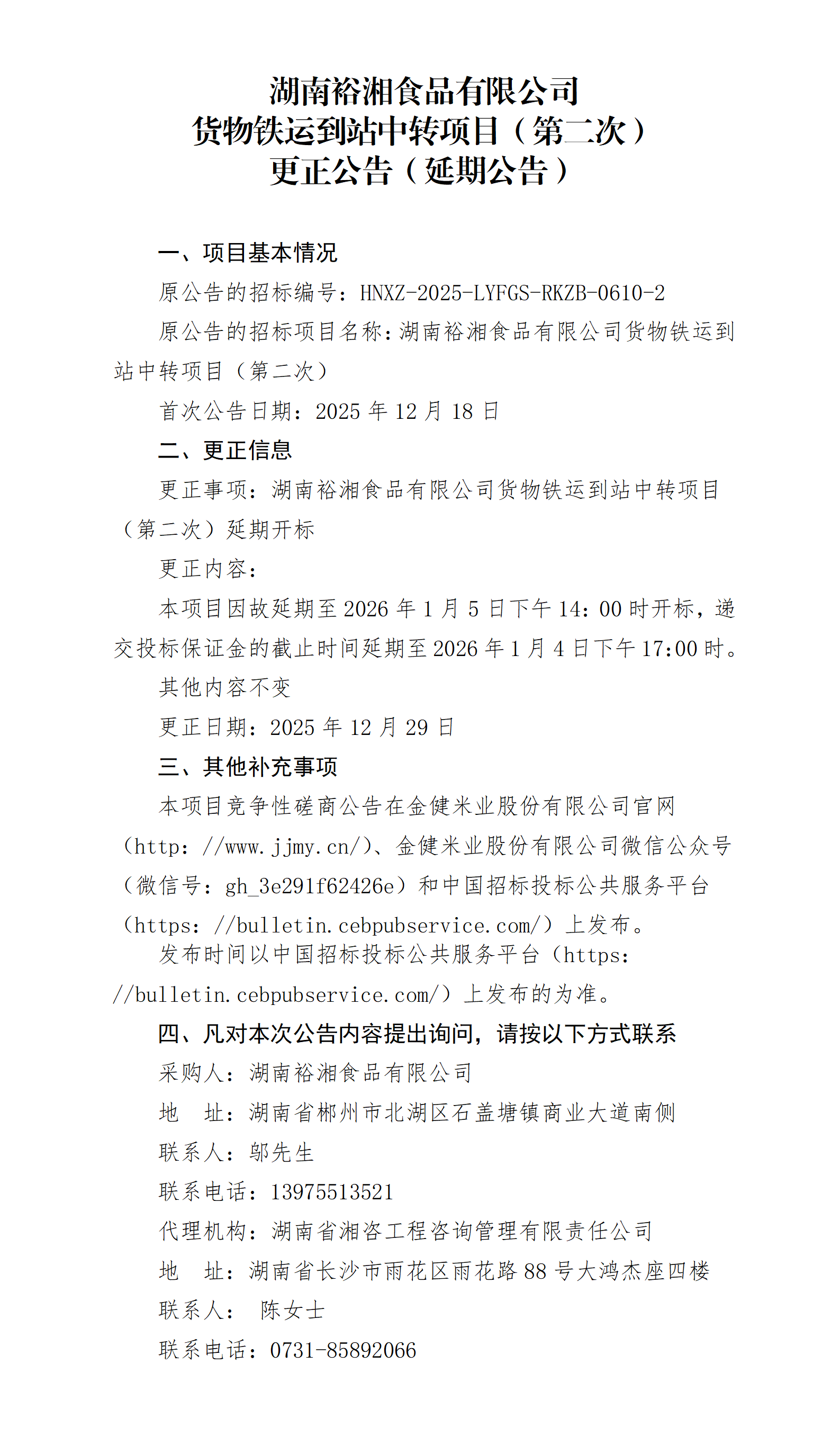 湖南裕湘食品有限公司货物铁运到站中转项目(第二次)更正公告(延期公告)