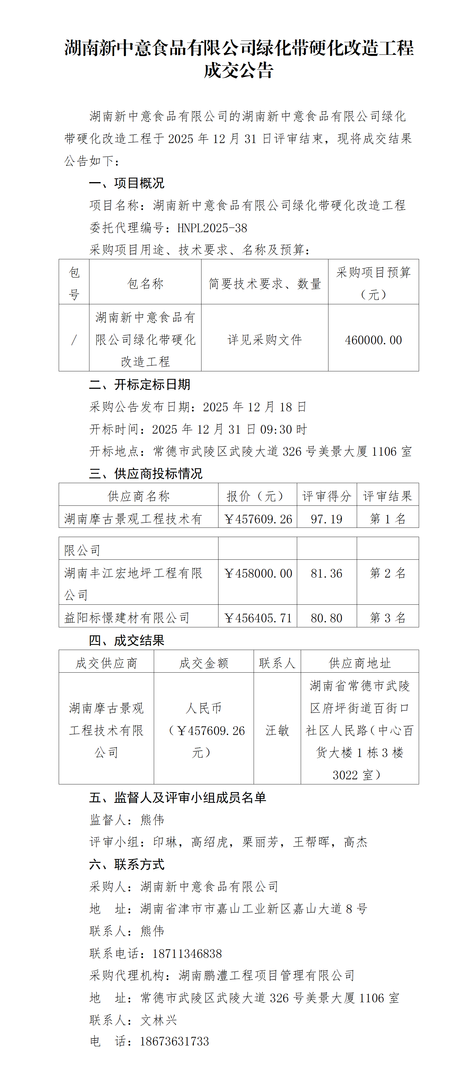 湖南新中意食品有限公司绿化带硬化改造工程成交公告