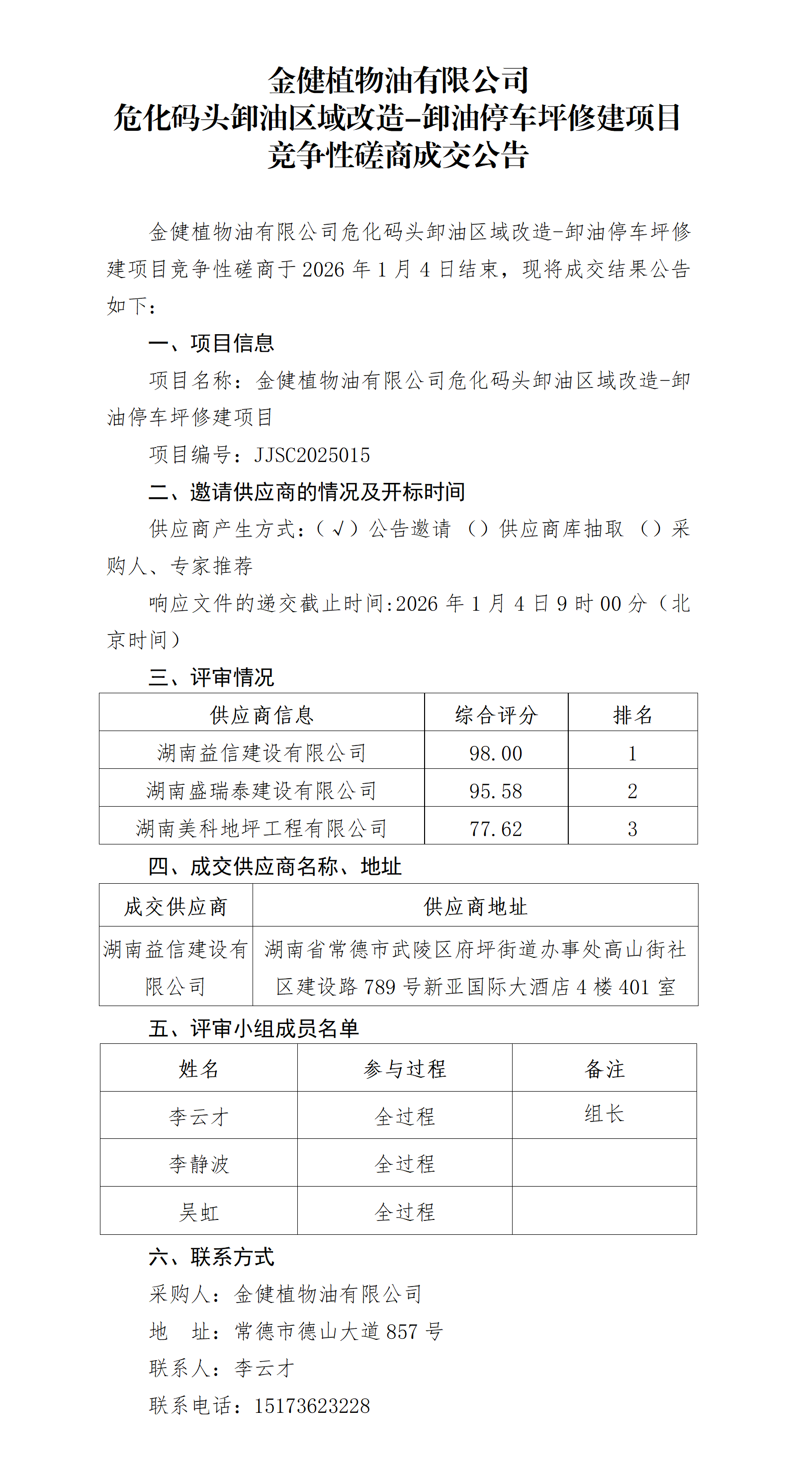 金健植物油有限公司危化码头卸油区域改造-卸油停车坪修建项目竞争性磋商成交公告
