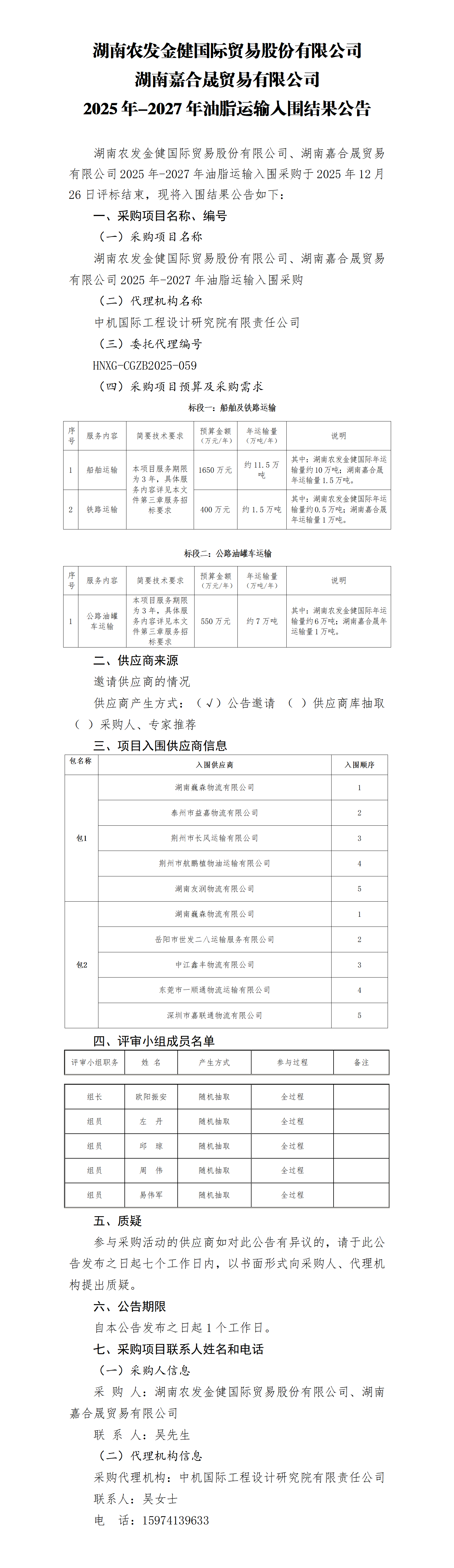 湖南农发金健国际贸易股份有限公司 湖南嘉合晟贸易有限公司 2025年-2027年油脂运输入围结果公告