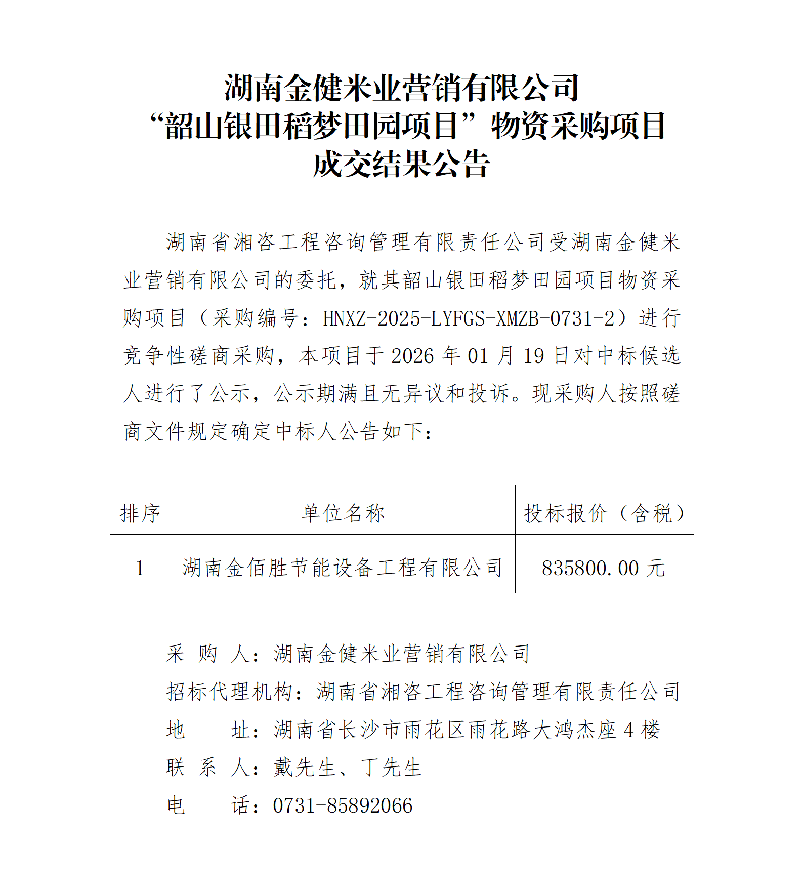 湖南金健米业营销有限公司“韶山银田稻梦田园项目”物资采购项目成交结果公告