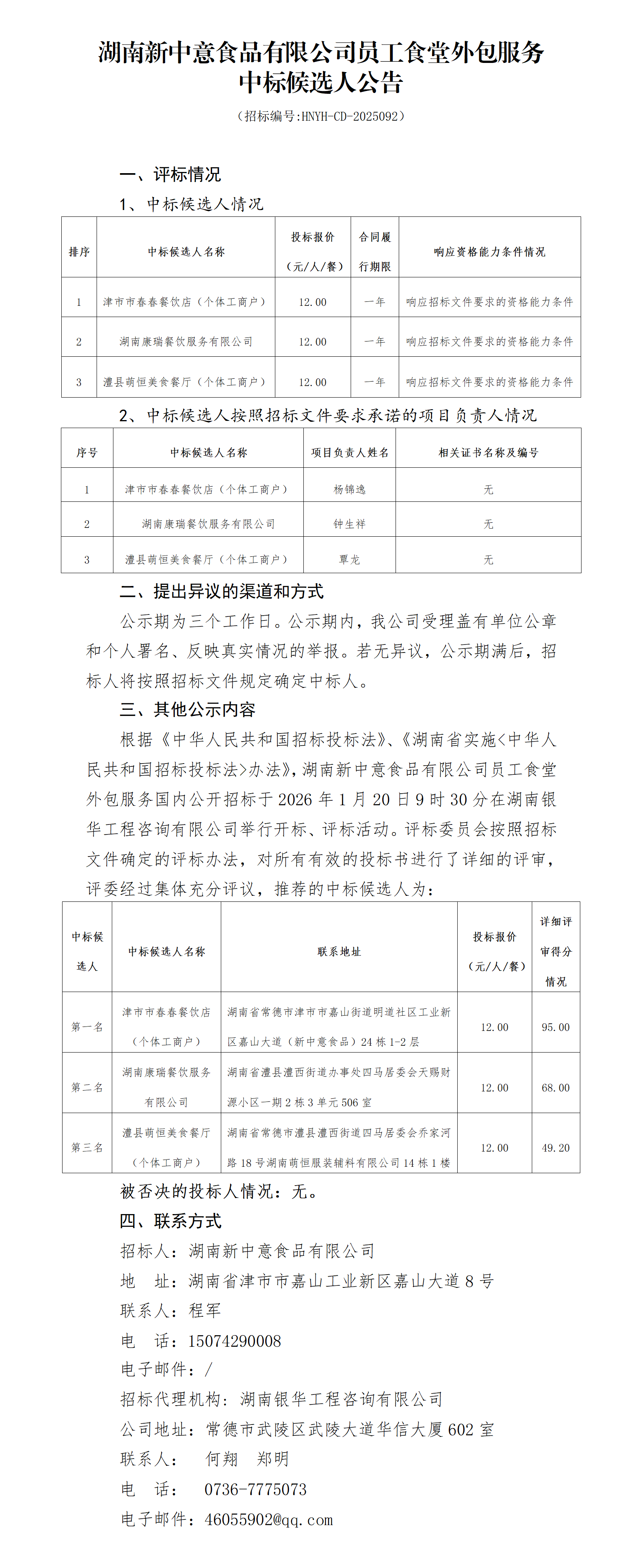 湖南新中意食品有限公司员工食堂外包服务中标候选人公告