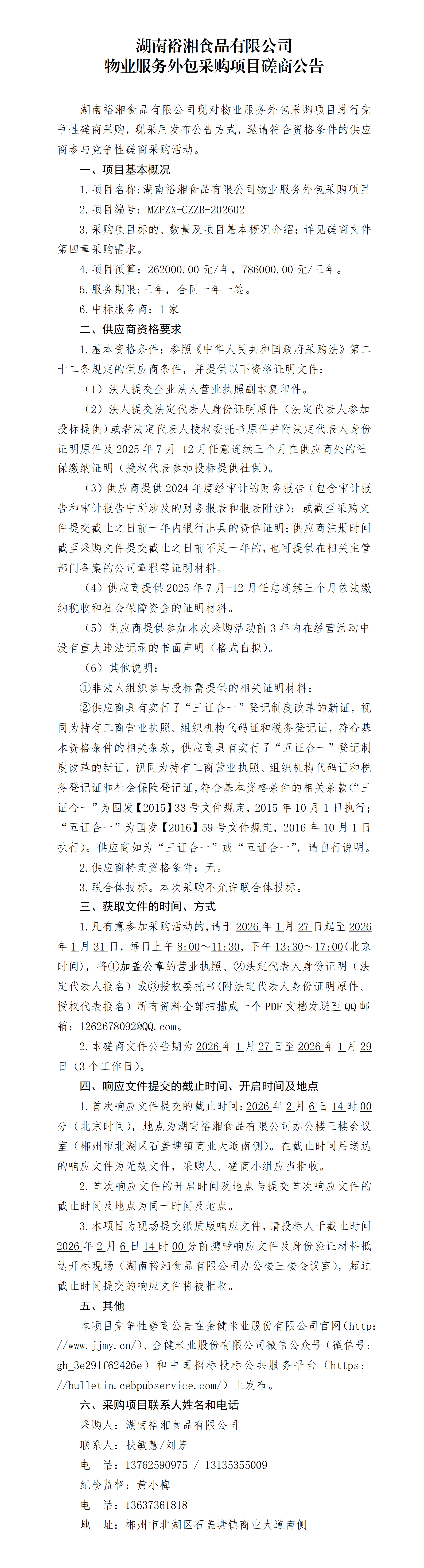 湖南裕湘食品有限公司物业服务外包采购项目磋商公告