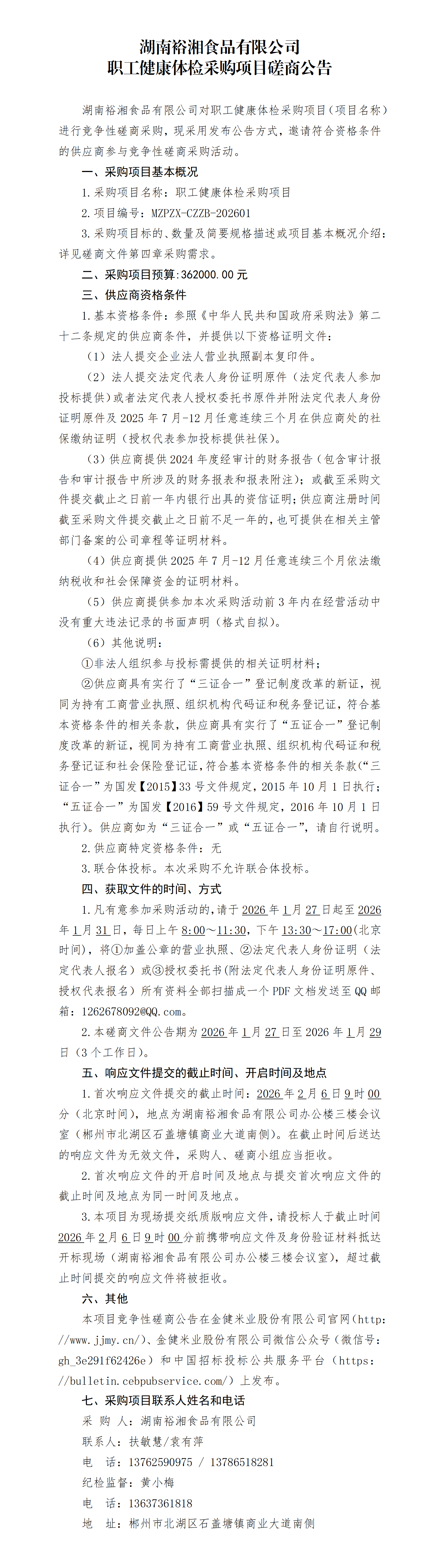 湖南裕湘食品有限公司职工健康体检采购项目磋商公告