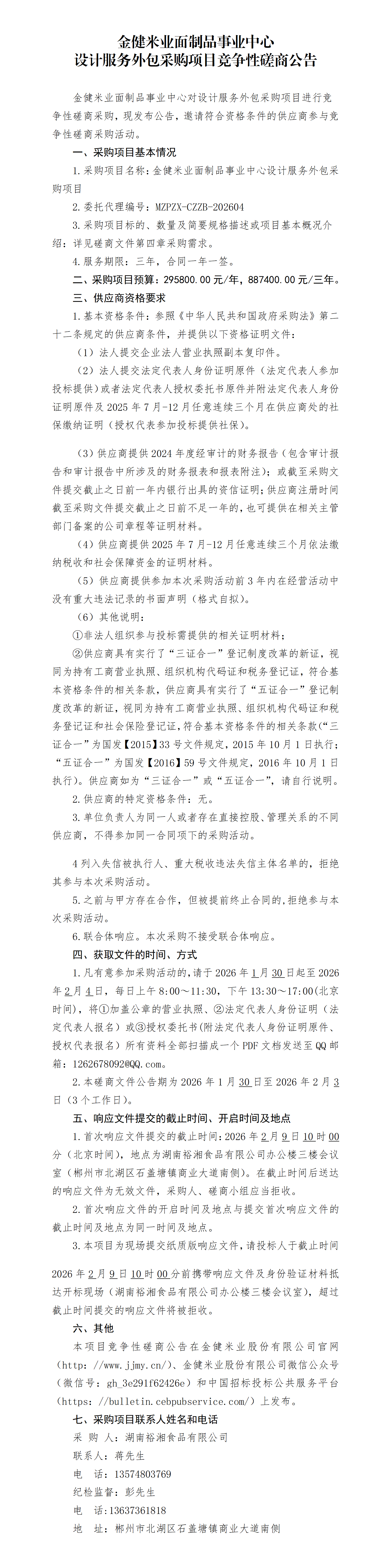 金健面制品事业中心设计服务外包采购项目竞争性磋商公告