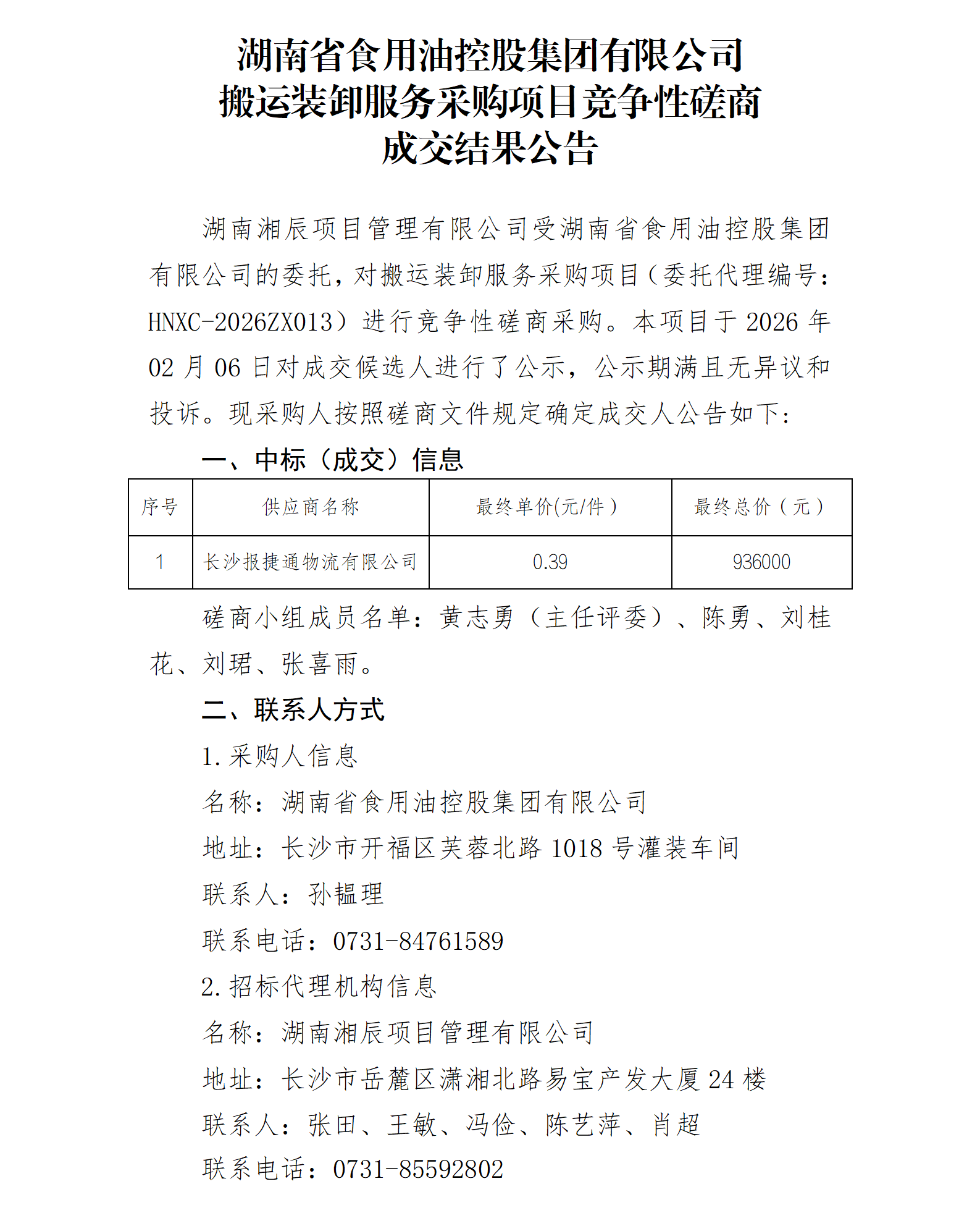 湖南省食用油控股集团有限公司搬运装卸服务采购项目竞争性磋商成交结果公告