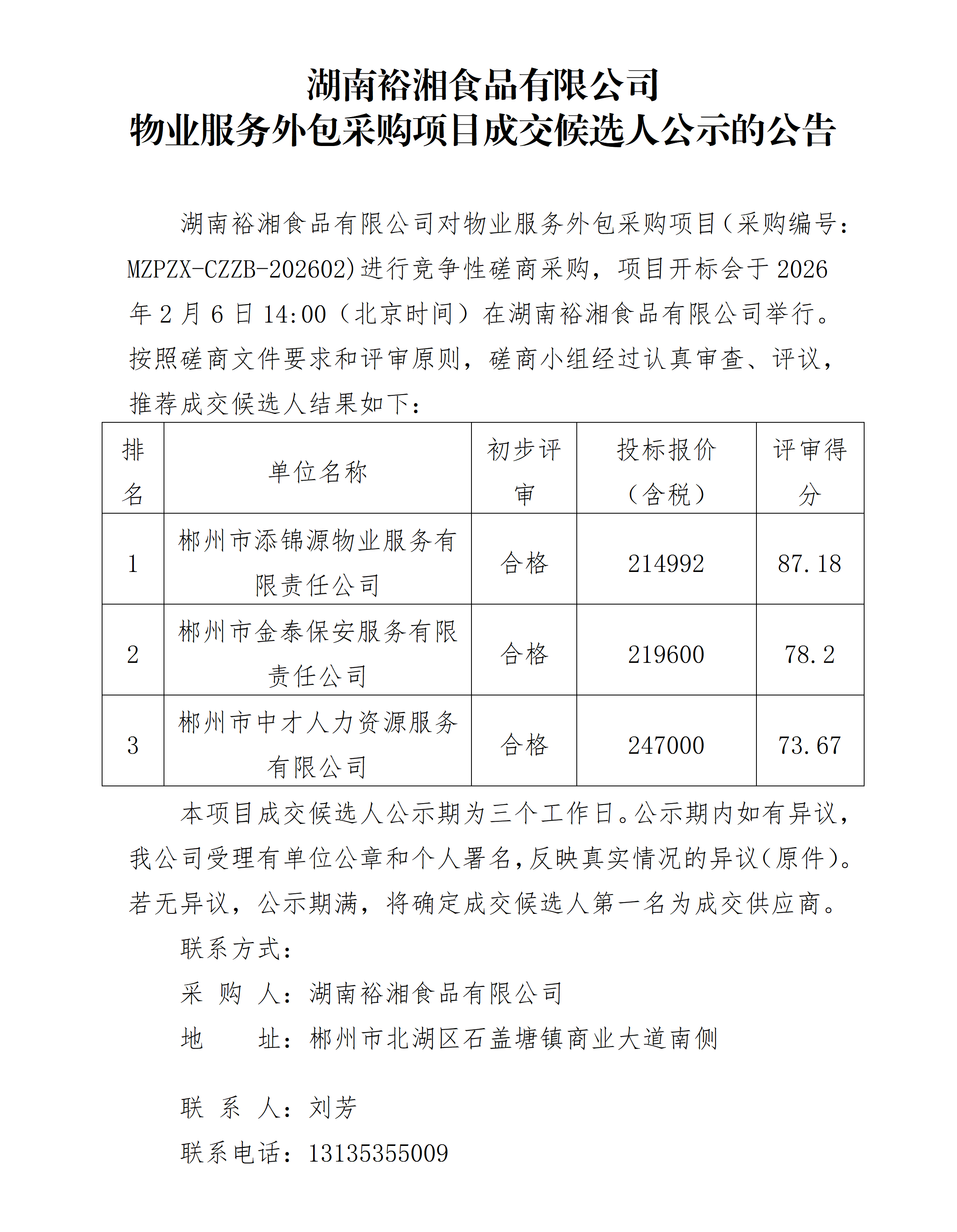 湖南裕湘食品有限公司物业服务外包采购项目成交候选人公示的公告