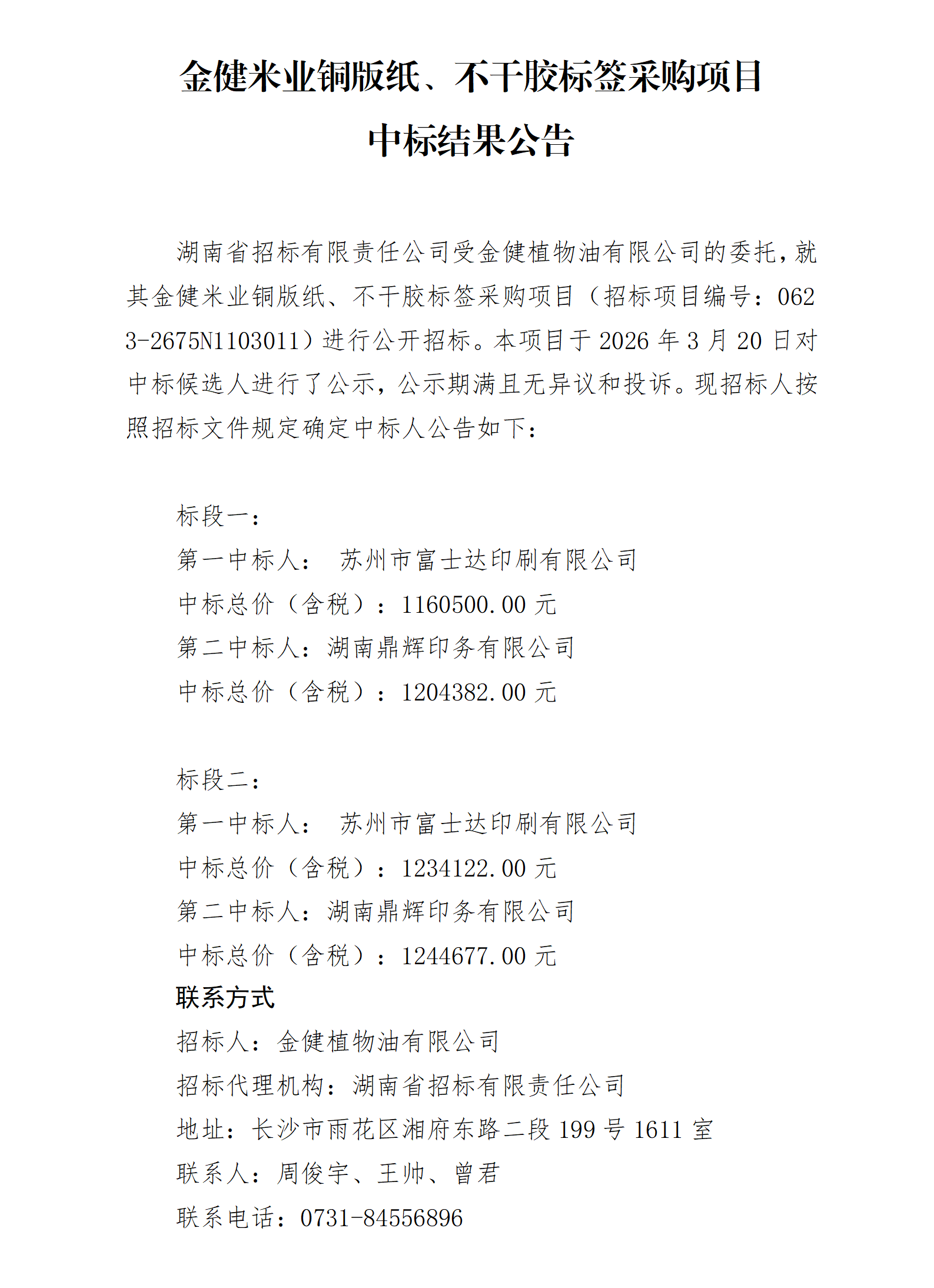 金健米业铜版纸、不干胶标签采购项目中标结果公告