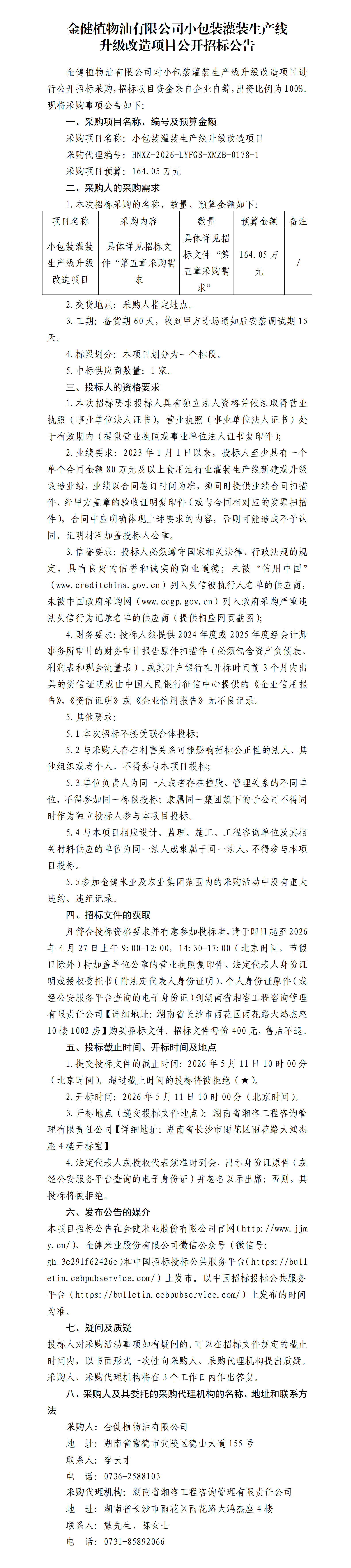 金健植物油有限公司小包装灌装生产线升级改造项目公开招标公告
