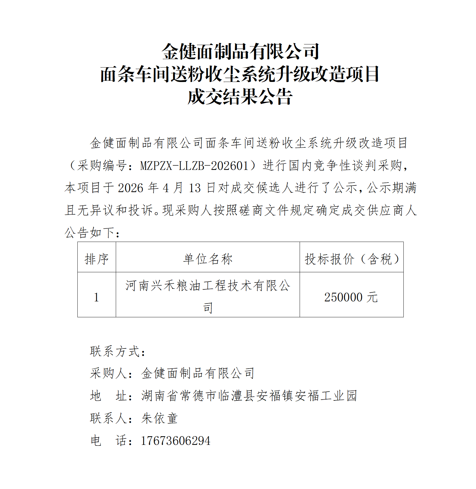 金健面制品有限公司面条车间送粉收尘系统升级改造项目成交结果公告