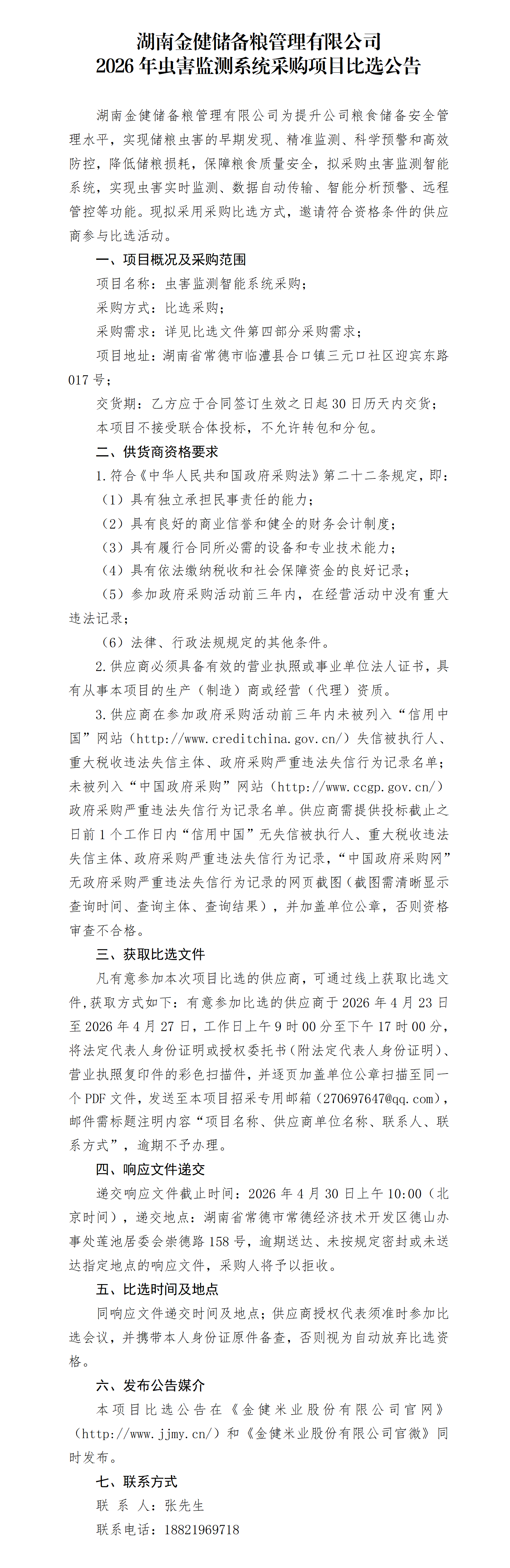 湖南金健储备粮管理有限公司2026年虫害监测系统采购项目比选公告