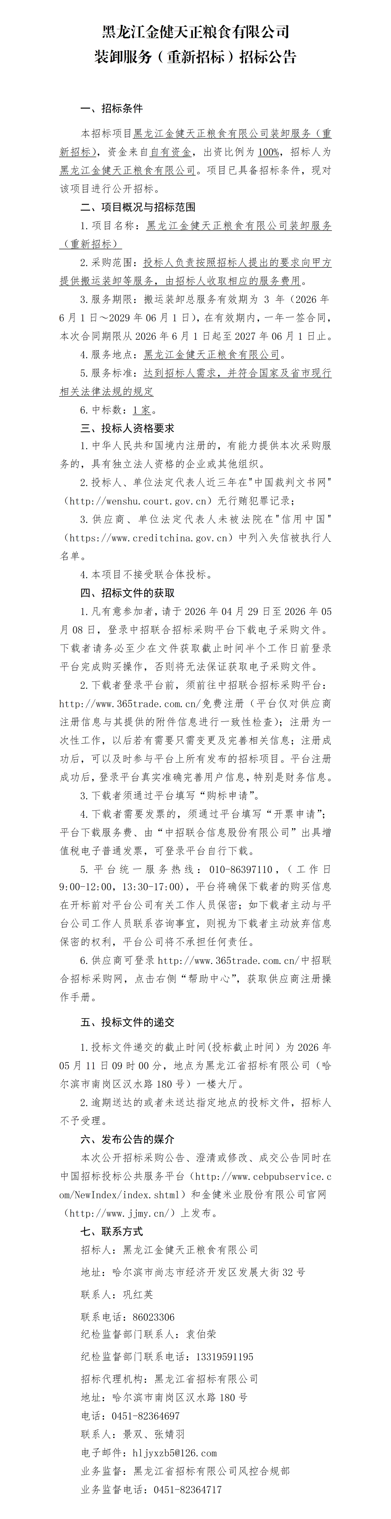 黑龙江金健天正粮食有限公司装卸服务(重新招标)招标公告